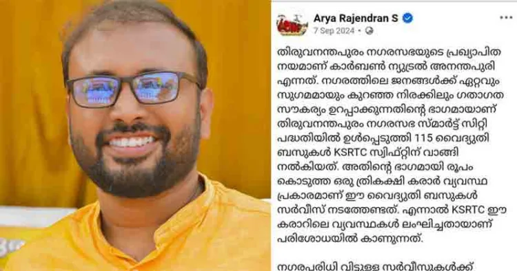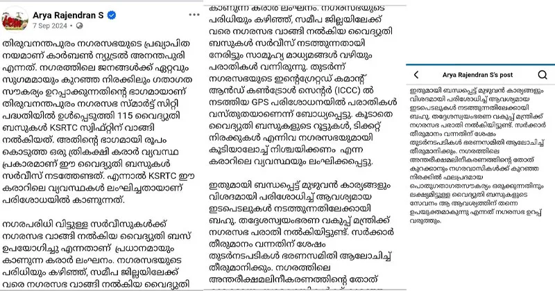 നഗരസഭയുടെ പരിധിയും കഴിഞ്ഞ് സമീപ ജില്ലയിലേക്ക് വരെ ഈ ബസുകൾ സർവീസ് നടത്തി. കൂടാതെ വൈദ്യുതി ബസുകളുടെ റൂട്ടുകൾ, ടിക്കറ്റ് നിരക്കുകൾ എന്നിവ നഗരസഭയുമായി കൂടിയാലോചിച്ച് നിശ്ചയിക്കണമെന്ന കരാറിലെ വ്യവസ്ഥയും ലംഘിക്കപ്പെട്ടു. ഇതിനെതിരെ നഗരസഭ തദ്ദേശസ്വയംഭരണ വകുപ്പ് മന്ത്രിക്ക് പരാതിയും നൽകിയിരുന്നുവെന്നും ആര്യാ രാജേന്ദ്രൻ പോസ്റ്റിൽ പറയുന്നു.