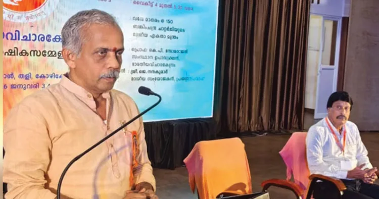 കോഴിക്കോട്: വന്ദേമാതരം എന്ന ഭാരതത്തിന്റെ വിശുദ്ധ മന്ത്രത്തെ വിഭജിച്ചില്ലായിരുന്നെങ്കില് ഭാരതം വിഭജിക്കപ്പെടുകയില്ലായിരുന്നുവെന്ന് പ്രജ്ഞാപ്രവാഹ് ദേശീയ സംയോജകന് ജെ. നന്ദകുമാര്. ഭാരതീയവിചാരകേന്ദ്രം വാര്ഷിക സമ്മേളനത്തില് ‘വന്ദേമാതരം @ 150- ബങ്കിം ചന്ദ്ര ചാറ്റര്ജിയുടെ ദേശീയ ഏകതാമന്ത്രം’ എന്ന വിഷയം അവതരിപ്പിക്കുകയായിരുന്നു അദ്ദേഹം.