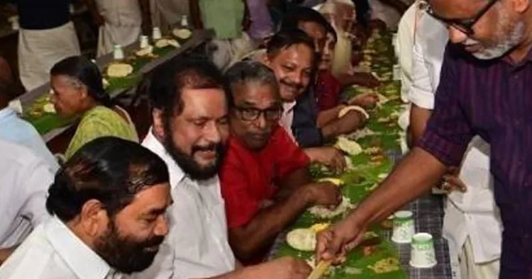 മന്ത്രി വി എന് വാസവന്, മുന് എം എല് എയും സി പി എം പത്തനംതിട്ട ജില്ലാ സെക്രട്ടറിയുമായ രാജു എബ്രഹാം, മുന് ദേവസ്വം ബോര്ഡ് പ്രസിഡന്റും സി പി എം പത്തനംതിട്ട ജില്ലാ സെക്രട്ടേറിയറ്റ് അംഗവുമായ എ പത്മകുമാര് തുടങ്ങിയവര്ക്കാണ് ഭഗവാന് നിവേദിക്കും മുന്പ് സദ്യ വിളമ്പിയത്.