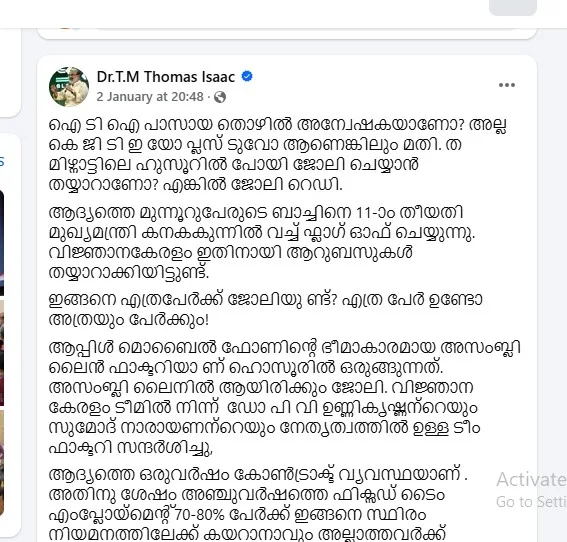 ഫേസ് ബുക്കിൽ തോമസ് ഐസക്ക് പറയുന്നത്, കേരളത്തിൽ ഐടിഐ പാസായ തൊഴിൽ അന്വേഷകരുണ്ടെങ്കിൽ തമിഴ്‌നാട്ടിലേക്ക് പൊയ്‌ക്കോളൂ എന്നാണ് ഐസക്ക് പറയുന്നത്. അവിടെ ഹുസൂറിൽ പോയി ജോലി ചെയ്യാൻ തയാറാണെങ്കിൽ ജോലി റെഡി എന്നാണ് വിവരണം.