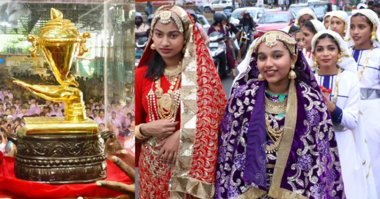 സംസ്ഥാന സ്കൂള് കലോത്സവ വിജയികള്ക്ക് സമ്മാനിക്കുന്ന സ്വര്ണകപ്പ് തൃശൂര് ജില്ലയിലെ വിവിധ സ്കൂളില് നിന്നും സ്വീകരണങ്ങള് ഏറ്റുവാങ്ങി കലാ നഗരിയിലെത്തി. ജില്ലയിലെ 14 സ്വീകരണ കേന്ദ്രങ്ങള് പിന്നിട്ട് തൃശൂര് സി എം എസ് സ്കൂളില് സ്വര്ണകപ്പ് ഘോഷയാത്ര സമാപിച്ചു. 12, 13 തീയതികളിലായി സംഘടിപ്പിച്ച സ്വര്ണക്കപ്പ് ഘോഷയാത്ര രണ്ടാം ദിനം വടക്കാഞ്ചേരി ഗവ. ബോയ്സ് ഹയര് സെക്കന്ഡറി സ്കൂളില് നിന്നും പര്യടനം ആരംഭിച്ചു. ഒല്ലൂര് സെന്റ് മേരിസ് സി ജി എച്ച് എസ് സ്കൂളിലെ ഘോഷയാത്ര സ്വീകരണം മന്ത്രി കെ. രാജന് ഉദ്ഘാടനം ചെയ്തു. പുതുക്കാട് സെന്റ് ആന്റണീസ് ഹയര് സെക്കന്ഡറി സ്കൂള്, ഇരിങ്ങാലക്കുട എല് എഫ് സി എച്ച് എസ് തുടങ്ങിയ സ്കൂളുകളില് സ്വര്ണ്ണ കപ്പിന് സ്വീകരണം ഒരുക്കിയിരുന്നു.