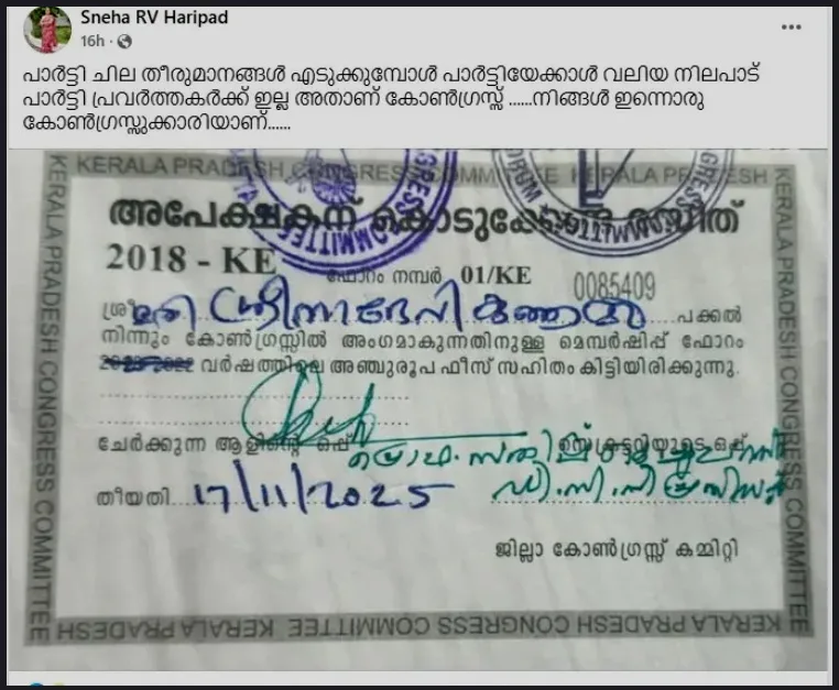 ‘പാർട്ടി ചില തീരുമാനങ്ങൾ എടുക്കുമ്പോൾ പാർട്ടിയെക്കാൾ വലിയ നിലപാട് പാർട്ടി പ്രവർത്തകർക്ക് ഇല്ല, അതാണ് കോൺഗ്രസ്. നിങ്ങൾ ഇന്നൊരു കോൺഗ്രസുകാരിയാണ്’ എന്നാണ് ആർ.വി. സ്‌നേഹ ഫെയ്‌സ്ബുക്കിൽ കുറിച്ചത്. ഇതോടൊപ്പം ശ്രീനാദേവി കുഞ്ഞമ്മയ്‌ക്ക് പാർട്ടി അംഗത്വം നൽകിയതിന്റെ രസീതിന്റെ ചിത്രവും ആർ.വി. സ്‌നേഹ ഫെയ്‌സ്ബുക്കിൽ പോസ്റ്റ് ചെയ്തിരുന്നു.