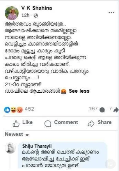 അതിനിടെ എഴുത്തുകാരി വി.കെ. ഷാഹിന ഒരു വിദ്വേഷ പോസ്റ്റുമായി എത്തിയിരിക്കുകയാണ്. “ആര്ത്തവം തുടങ്ങിയത്രേ. ആഘോഷിക്കാതെ തരമില്ലല്ലോ. നാലാളെ അറിയിക്കണമല്ലോ. വെളിച്ചം കാണാത്തയിടങ്ങളില് രോമം വളര്ന്ന കാര്യം പന്തലുകെട്ടി നാലാളെ അറിയിക്കുന്ന കാലം തിരിച്ചുവരികയാണ്. വഴികാട്ടിയായൊരു വാരിക (മലയാള മനോരമയുടെ വനിത മാസിക) പരസ്യം ചെയ്യാനും. 21ാം നൂറ്റാണ്ടിലെ ഡാഷിലെ ആചാരങ്ങള്”- ഇതാണ് ഷാഹിന പങ്കുവെച്ച കുറിപ്പ്.