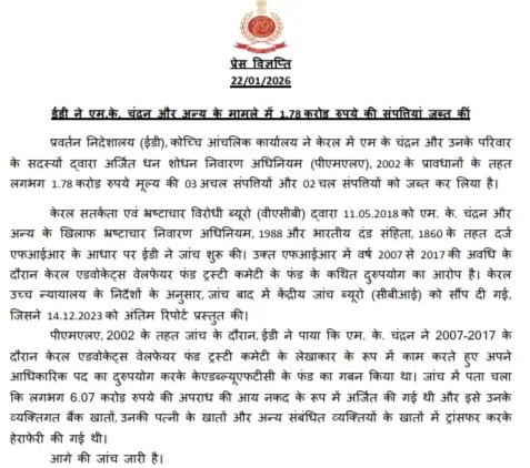 തിരുവനന്തപുരം: കേരള അഡ്വക്കേറ്റ്സ് വെൽഫെയർ ഫണ്ട് ട്രസ്റ്റി കമ്മിറ്റിയുടെ ഫണ്ട് ദുരുപയോഗം ചെയ്തതുമായി ബന്ധപ്പെട്ട കേസിൽ, 2002 ലെ പിഎംഎൽ ആക്ട് പ്രകാരം താൽക്കാലികമായി ഇഡിയുടെ കൊച്ചി സോണൽ ഓഫീസ്, കേരള അഡ്വക്കേറ്റ്സ് വെൽഫെയർ ഫണ്ട് ട്രസ്റ്റി കമ്മിറ്റിയുടെ (കെഎഡബ്ല്യുഎഫ്‌ടിസി) അന്നത്തെ അക്കൗണ്ടന്റായിരുന്ന എം.കെ. ചന്ദ്രനും അദ്ദേഹത്തിന്റെ കുടുംബാംഗങ്ങളും കേരളത്തിൽ സ്വന്തമാക്കിയ 1.78 കോടി രൂപ വിലമതിക്കുന്ന 3 സ്ഥാവര വസ്തുക്കളും 2 ജംഗമ വസ്തുക്കളും കണ്ടുകെട്ടി.