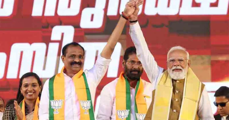 എന്‍ഡിഎ തെരഞ്ഞെടുപ്പ് പ്രചരണത്തിന് തുടക്കം കുറിച്ച് എറണാകുളം കലൂര്‍ സ്റ്റേഡിയത്തില്‍ സംഘടിപ്പിച്ച മഹാറാലിയെ പ്രധാനമന്ത്രി നരേന്ദ്ര മോദി അഭിവാദ്യം ചെയ്യുന്നു