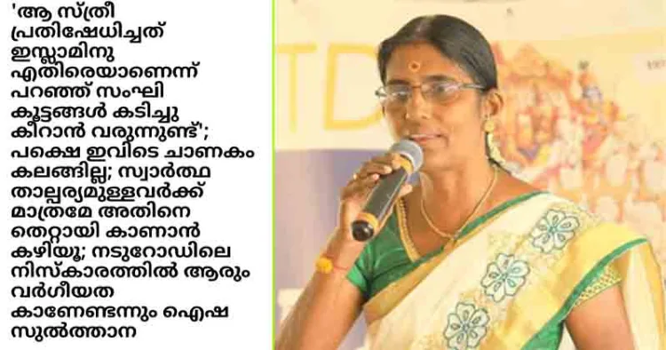 പാലക്കാട് നടു റോഡിൽ അനീസ എന്ന സ്ത്രീ നടത്തിയ നിസ്കാരത്തിൽ ആരും വർഗീയത കാണേണ്ടെന്നും സ്വാർത്ഥ താത്പര്യം ഉള്ളവർക്കേ അതിനെ തെറ്റായി കാണാൻ കഴിയൂ എന്നുമുള്ള സംവിധായിക ഐഷ സുൽത്താനയുടെ ഫേസ്ബുക്ക് പോസ്റ്റിന് മറുപടിയായാണ് ശശികല ടീച്ചറും ഫേസ്ബുക്ക് പോസ്റ്റുമായി രംഗത്ത് വന്നത്.