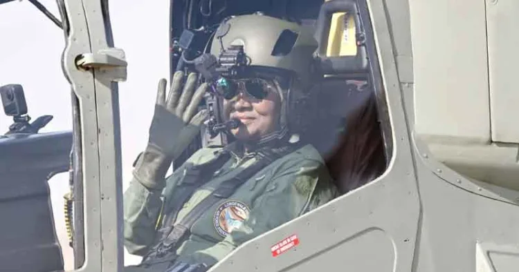 “പ്രചണ്ഡ് ഹെലികോപ്റ്റർ സ്വാശ്രയത്വത്തിന്റെ ശക്തമായ പ്രതീകമാണ്. ഈ നിമിഷം, ഞാൻ ജയ്സാൽമീർ ജില്ലയ്‌ക്ക് മുകളിലൂടെ പറക്കുകയാണ്. നമ്മുടെ ധീരരായ സൈനികർക്ക് എന്റെ ഹൃദയംഗമമായ ആശംസകളും അഗാധമായ നന്ദിയും അറിയിക്കുന്നു. ജയ് ഹിന്ദ്, ജയ് ഭാരത്, നിങ്ങൾക്ക് ഊഷ്മളമായ സല്യൂട്ട്,” കോക് പിറ്റിൽ ഇരുന്ന് രാഷ്‌ട്രത്തോടായി അവർ പറഞ്ഞു.