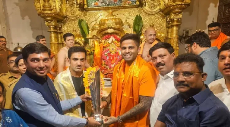 മുംബൈ ; ഐസിസി ടി20 ലോകകപ്പ് നേടിയ ഇന്ത്യൻ ടീം നായകൻ മുംബൈയിലെ പ്രശസ്തമായ ശ്രീ സിദ്ധിവിനായക ക്ഷേത്രത്തിൽ ട്രോഫിയുമായി എത്തി പ്രാർത്ഥന നടത്തി.ക്യാപ്റ്റൻ സൂര്യകുമാർ യാദവും മുഖ്യ പരിശീലകൻ ഗൗതം ഗംഭീറുമാണ് ദർശനം നടത്താൻ എത്തിയത്.