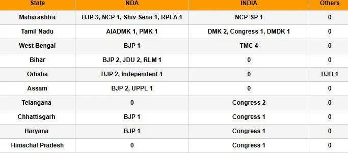 പശ്ചിമ ബംഗാൾ: ബിജെപി 1 ടിഎംസി 4 , ബീഹാർ: ബിജെപി 2, ജെഡിയു 2, ആർഎൽഎം 1 , ഒഡീഷ: ബിജെപി 2, സ്വതന്ത്രൻ 1 0 ബിജെഡി 1,