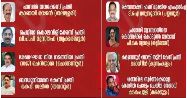 തലശേരി സ്ഥാനാര്ത്ഥി കാരായി രാജന് ഫസല് വധക്കേസ് പ്രതിയാണ്. തൃക്കരിപ്പൂരിലെ വിപിപി മുസ്തഫ പെരിയ കൊലവിളിക്കേസിലെ പ്രതിയാണ്. ചെങ്ങന്നൂര് സ്ഥാനാര്ഥിയും ഇപ്പോള് മന്ത്രിയുമായ സജി ചെറിയാന് ഭരണഘടനയെ കുന്തം കുടച്ചക്രം എന്ന് വിളിച്ച് പരിഹസിച്ച കേസില്പെട്ട ആളാണ്. തവനൂരിലെ കെ.ടി. ജലീല് ബന്ധുനിയമനക്കേസിലെ പ്രതിയെന്ന ആരോപണമുള്ളയാളാണ്. .