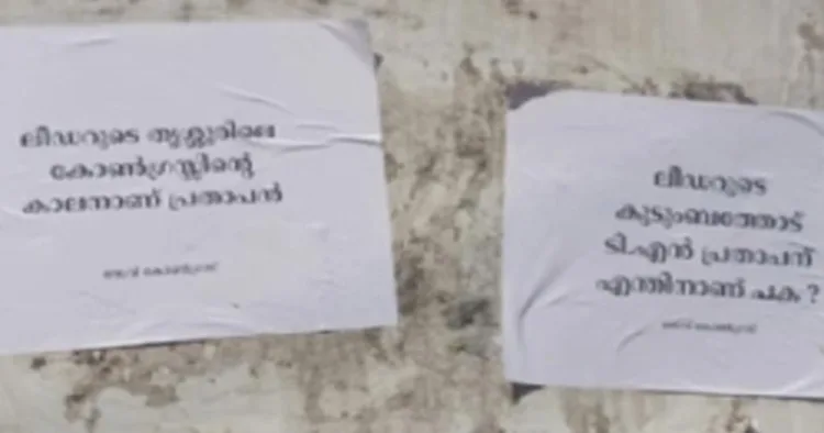ലീഡറുടെ തൃശൂരിലെ കോണ്ഗ്രസിന്റെ കാലനാണ് പ്രതാപന്, ലീഡറുടെ കുടുംബത്തോട് ടി എന് പ്രതാപന് എന്തിനാണ് പക എന്നിങ്ങനെയാണ് പോസ്റ്ററുകളില് എഴുതിയിരുന്നത്. പ്രസ് ക്ലബിന് മുന്നിലും മുരളീമന്ദിരത്തിന് മുന്നിലുമാണ് പോസ്റ്ററുകള് പ്രത്യക്ഷപ്പെട്ടത്.