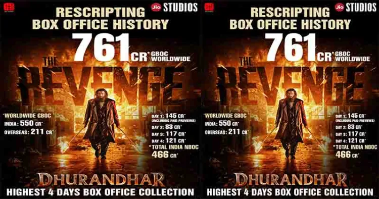 ജിയോ സ്റ്റുഡിയോസും ബി 62 സ്റ്റുഡിയോസും ചേർന്ന് നിർമ്മിച്ച, ആദിത്യ ധർ – രൺവീർ സിങ് ചിത്രം ‘ധുരന്ധർ പ്രതികാരം’ ആദ്യ വീക്കെൻഡ് കൊണ്ട് തന്നെ എക്കാലത്തെയും വലിയ ഇന്ത്യൻ ബ്ലോക്ക്ബസ്റ്റർ ചിത്രങ്ങളുടെ പട്ടികയിൽ. ആദ്യ വീക്കെൻഡ് പിന്നിടുമ്പോൾ ചിത്രം നേടിയ ആഗോള ഗ്രോസ് കളക്ഷൻ 761 കോടി രൂപ. ഇന്ത്യൻ സിനിമയിലെ ബോക്സ് ഓഫീസ് ചരിത്രം മാറ്റിയെഴുതുന്ന ചിത്രം, ആഗോള തലത്തിൽ അഭൂതപൂർവമായ വിജയമാണ് നേടുന്നത്. ഇന്ത്യക്ക് അകത്തും പുറത്തും ഒരു ഇന്ത്യൻ ചിത്രം നേടുന്ന ഏറ്റവും ഉയർന്ന ആദ്യ വീക്കെൻഡ് കളക്ഷൻ ആണ് ചിത്രം സ്വന്തമാക്കിയത്. അമ്പരപ്പിക്കുന്ന അഡ്വാൻസ് ബുക്കിങ്ങും പ്രീമിയർ ഷോ മുതൽ ലഭിച്ച ഗംഭീര പ്രേക്ഷക പ്രതികരണവും ചിത്രത്തെ ഇതിഹാസ സമാനമായ വിജയമാക്കിയാണ് മാറ്റുന്നത്.