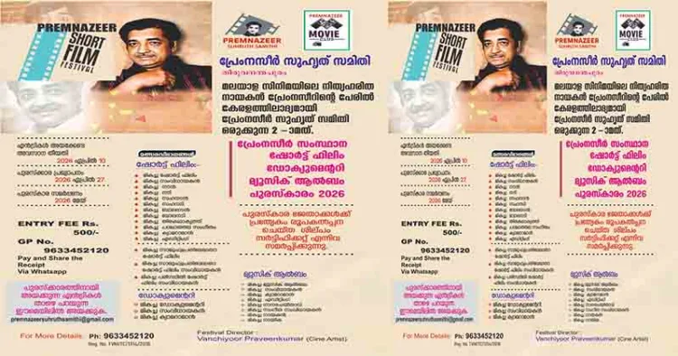തിരു: പ്രേംനസീർ സുഹൃത് സമിതി രണ്ടാമത് പ്രേംനസീർ സംസ്ഥാന ഷോർട്ട് ഫിലിം, ഡോക്യുമെൻ്ററി, മ്യൂസിക്ക് ആൽബം പുരസ്ക്കാരങ്ങൾക്ക് വിവിധ കാറ്റഗറികളിലായി ഏപ്രിൽ 10 നകം എൻട്രികൾ ക്ഷണിക്കുന്നു. കൂടുതൽ വിവരങ്ങൾക്ക് 9633452120 നമ്പരിൽ ബന്ധപ്പെടണമെന്ന് സംസ്ഥാന സെക്രട്ടറി തെക്കൻ സ്റ്റാർ ബാദുഷ അറിയിച്ചു