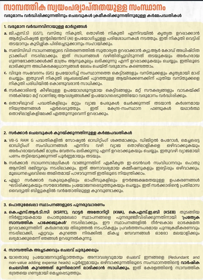 തിരുവനന്തപുരം: സാമ്പത്തിക സ്വയം പര്യാപ്തതയുള്ള സംസ്ഥാനം എന്ന കാഴ്ചപ്പാടാണ് ബിജെപി മുന്നോട്ടുവയ്‌ക്കുന്നത. വരുമാനം വര്‍ദ്ധിപ്പിക്കുന്നതിനും ചെലവുകള്‍ ക്രമീകരിക്കുന്നതിനുള്ള കര്‍മ്മപദ്ധതികള്‍ നടപ്പിലാക്കും. സര്‍ക്കാര്‍ ചെലവുകള്‍ കുറയ്‌ക്കുന്നതിനുള്ള കര്‍മ്മപദ്ധതികള്‍, പൊതുമേഖലാസ്ഥാനങ്ങളുടെ പുനരുദ്ധാരണം തുടങ്ങിയ ഇതില്‍പ്പെടുന്നു കൂടുതല്‍ അറിയാം……