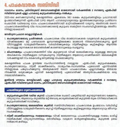തിരുവനന്തപുരം: യുദ്ധകാലത്ത് മാത്രമല്ല ഈ ഉറപ്പ്, വീട്ടമ്മമാർക്ക് സന്തോഷം ഉറപ്പാക്കാൻ ആവശ്യത്തിന് പാചക വാതകം മുട്ടില്ലാതെ ഉറപ്പാക്കുമെന്ന് എൻഡിഎ പ്രകടന പത്രിക. അടുക്കളയിൽനിന്ന് പുകയെ പുറത്താക്കിയ ബിജെപി-മോദി സർക്കാരിന്റെ ഉജ്ജ്വല പോലുള്ള ഊർജ്ജ പദ്ധതികളുടെ തുടർച്ചയാണ് എൻഡിഎ സർക്കാരിന്റെ ഈ പദ്ധതി.