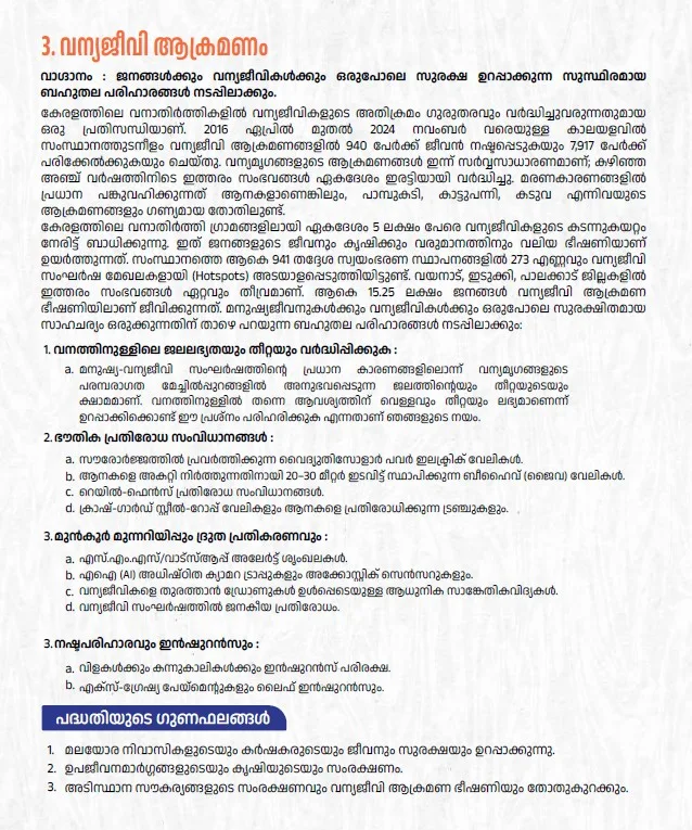 തിരുവനന്തപുരം: കേരളത്തിലെ വനാതിര്‍ത്തികളില്‍ ഏകദേശം അഞ്ച് ലക്ഷം പേരെ വന്യജീവികളുടെ കടന്നുകയറ്റം നേരിട്ടു ബാധിക്കുന്നു. ഇത് ജനങ്ങളുടെ ജീവനും കൃഷിക്കും വരുമാനത്തിനും വലിയ ഭീഷണിയാണ് ഉയര്‍ത്തുന്നത്. മനുഷ്യജീവുകള്‍ക്കും വന്യജീവികള്‍ക്കും ഒരുപോലെ സുരക്ഷിതമായ സാഹചര്യം ഒരുക്കും.