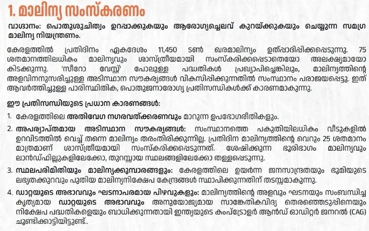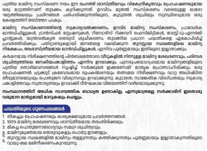 കർശനമായ നിരീക്ഷണത്തിന്റെ പിൻബലത്തോടെ വീടുകളിൽ നിന്നുള്ള മാലിന്യ ശേഖരണവും, പരിസര ശുചിത്വത്തിലെ ജനകീയപങ്കാളിത്തം എന്നിവ ഉറപ്പാക്കും. പുനരുപയോഗപ്രദമായ മാലിന്യങ്ങളിലൂടെ പുതിയ തൊഴിലവസരങ്ങൾ സൃഷ്ടിച്ച് ‘സർക്കുലർ ഇക്കണോമി’ മാതൃക പ്രോത്സാഹിപ്പിക്കും. ഒരു പ്രൊഫഷണൽ ചട്ടക്കൂട് ക്രമബദ്ധമായ രൂപകൽപ്പനയും തത്സമയ സപരീക്ഷണവും ഡാറ്റ അധിഷ്ഠിത തീരുമാനമെടുപ്പും പൊതുജന വിശ്വാസവും ഉറപ്പാക്കുന്നു. കൂടാതെ, സാങ്കേതിക വിദഗ്ധതയും സ്വകാര്യ പങ്കാളിത്തവും സുതാര്യതയും ഉറപ്പാക്കി ദീർഘകാല വിജയത്തിന് വഴിയൊരുക്കുന്നു.