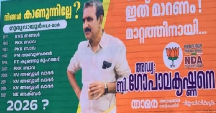 ക്ഷേത്രനഗരിയായിട്ടും ഗുരുവായൂര്‍ മണ്ഡലത്തില്‍ 1977 മുതല്‍ ഹിന്ദുസമുദായത്തെ പ്രതിനിധീകരിച്ച് ആരും എംഎല്‍എ ആയിട്ടില്ലെന്ന വിമര്‍ശനമുയര്‍ത്തിയ ഗൂരുവായൂരിലെ ബിജെപി സ്ഥാനാര്‍ത്ഥി ബി. ഗോപാലകൃഷ്ണന്‍ ഫ്ലെക്സ് ബോര്‍ഡില്‍ മറ്റൊരു വിവാദത്തിന് തിരികൊളുത്തി.