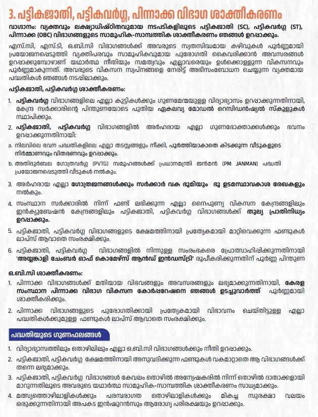 തിരുവനന്തപുരം: പട്ടിക ജാതി/വർഗ്ഗ വിഭാഗങ്ങളിൽ അർഹരായവർക്കെല്ലാം വീടുകൾ നൽകുകയും എല്ലാ ഗോത്രവർഗ്ഗക്കാർക്കും സർക്കാർ വക ഭൂമിയും പട്ടയവും നൽകുമെന്ന് ഉറപ്പുനൽകുന്ന എൻഡിഎ വാഗ്ദാന പത്രിക പട്ടികജാതി പട്ടികവർഗ്ഗ വിഭാഗങ്ങളിൽനിന്നുള്ള സംരംഭകരെ പ്രോത്സാഹിപ്പിക്കാൻ ‘അയ്യങ്കാളി ചേംബർ ഓഫ് കൊമേഴ്സ് ആൻഡ് ഇൻഡസ്ട്രി’ രൂപീകരിക്കും. പത്രിക പറയുന്നു.