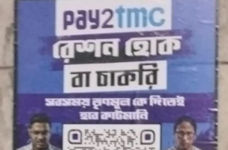 ഭരണകക്ഷിയായ തൃണമൂൽ കോൺഗ്രസിന്റെ (ടിഎംസി) ‘പണമിടപാട്’ സംസ്കാരത്തെ പരിഹസിക്കുന്ന പോസ്റ്ററുകൾ നഗരത്തിലെ മാർക്കറ്റുകളിലും ബസ് സ്റ്റോപ്പുകളിലും തിരക്കേറിയ ഗതാഗത കേന്ദ്രങ്ങളിലും പ്രത്യക്ഷപ്പെട്ടു, ബിജെപി ഐടി സെൽ മേധാവി അമിത് മാളവ്യ ഇത് പങ്കുവെച്ചു. പോസ്റ്ററുകളിൽ ‘പേ ടു ടി എം സി’ എന്ന് ലേബൽ ചെയ്ത ഒരു വലിയ ക്യുആർ കോഡും ഗുണ്ടാ പിരിവ്, കള്ള റേഷൻ എന്നിങ്ങനെയുള്ള വിവരണങ്ങളും ഉൾപ്പെടുത്തിയിട്ടുണ്ട്, അതായത് ‘റേഷനായാലും ജോലിയായാലും… സ്കാൻ ചെയ്യുക’.