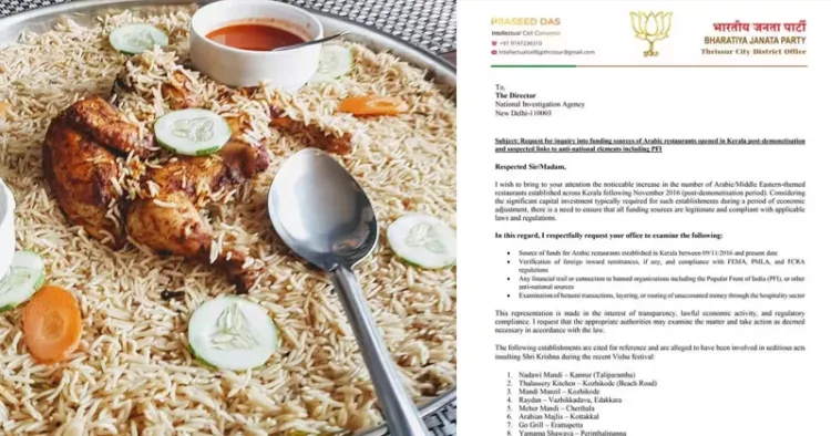 കൊച്ചി: കേരളത്തില്‍ അതിവേഗം മുളച്ച് പൊങ്ങിയ അറബിക് റെസ്റ്റോറന്റുകളുടെ സാമ്പത്തിക സ്രോതസുകളെക്കുറിച്ച് അന്വേഷണം ആവശ്യപ്പെട്ട് എന്‍ഐഎക്ക് പരാതി. ബിജെപി തൃശൂര്‍ ജില്ലാ ഇന്റലക്ച്വല്‍ സെല്‍ കണ്‍വീനര്‍ പ്രസീദ് ദാസാണ് പരാതി അയച്ചിരിക്കുന്നത്. ഇത്തരം റെസ്റ്റോറന്റുകള്‍ കേന്ദ്രീകരിച്ച് രാജ്യവിരുദ്ധ പ്രവര്‍ത്തനങ്ങള്‍ നടക്കുന്നുണ്ടോ എന്നത് പരിശോധിക്കണമെന്നും കത്തില്‍ ആവശ്യപ്പെട്ടിട്ടുണ്ട്.