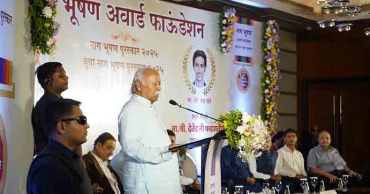 സോളാര്‍ ഇന്‍ഡസ്ട്രി ചെയര്‍മാന്‍ പദ്മശ്രീ സത്യനാരായണ നുവാളിന് നാഗഭൂഷണ്‍ പുരസ്‌കാരം സമ്മാനിച്ച് സംസാരിക്കുകയായിരുന്നു സര്‍സംഘചാലക്. അയണ്‍ മാന്‍ ഓസ്ട്രേലിയ മത്സരത്തിലെ വിജയി ദക്ഷ് ഖാനെയും പരിപാടിയില്‍ ആദരിച്ചു.