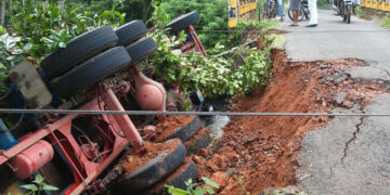 അപ്രോച്ച് റോഡ് തകര്ന്ന്് ട്രയ്ലര് തോട്ടിലേക്ക് മറിഞ്ഞു