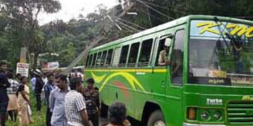 കാര് ഇടിച്ചിട്ട വൈദ്യുതി പോസ്റ്റ് ബസിന് മുകളിലേക്ക് വീണു: വന് ദുരന്തം ഒഴിവായി