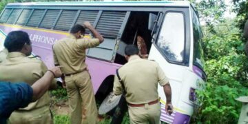 കൊക്കയിലേക്ക് ചെരിഞ്ഞ ബസ് മരത്തില് തട്ടി നിന്നു; വഴിമാറിയത് വന് ദുരന്തം