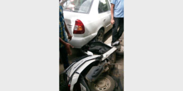 പിറകോട്ടുരുണ്ട സ്കൂട്ടര് ബസിടിച്ച് തകര്ന്നു