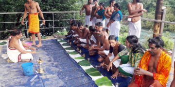 Kannur കാര്ത്തികപുരം ശ്രീ ധര്മ്മശാസ്താ ക്ഷേത്ര ഓഡിറ്റോറിയത്തില് ലക്ഷ്മികാന്ത അഗ്ഗിത്തായുടെ മുഖ്യകാര്മ്മിത്വത്തില് പിതൃതര്പ്പണം നടത്തുന്നു
