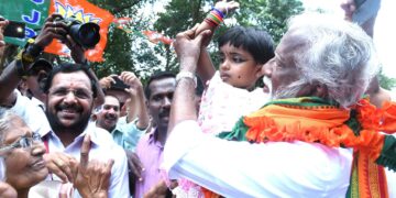 Kottayam ഭാരത് മാതാ കീജയ്….നീര്പ്പാറയില് സ്വീകരണം നല്കിയപ്പോള് ബാലികയ്ക്കൊപ്പം കുമ്മനം രാജശേഖരന്