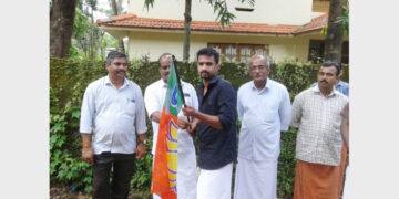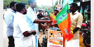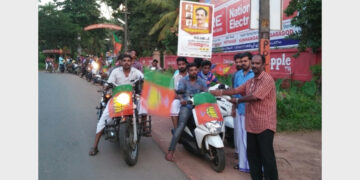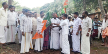 Kannur മട്ടന്നൂരില് നടന്ന ബൈക്ക് റാലി ബിജെപി മണ്ഡലം പ്രസിഡണ്ട് പുതുക്കുടി രാജന് യുവമോര്ച്ച ജില്ലാ സെക്രട്ടറി ഉദേഷ് കുയിലൂരിന് പതാക കൈമാറി ഉദ്ഘാടനം ചെയ്യുന്നു