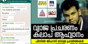 India കലാപം നടത്താന് മനഃപൂര്വം ശ്രമിച്ച് ജിഹാദി മാധ്യമപ്രവര്ത്തകര്; വിദ്യാര്ത്ഥികള് വെടിയേറ്റ് മരിച്ചെന്ന് മാധ്യമ ഗ്രൂപ്പുകളില് വ്യാജപ്രചരണം; ഏറ്റുപിടിച്ച് മനോരമയും ഏഷ്യാനെറ്റും 24ന്യൂസും മീഡിയാവണ്ണും