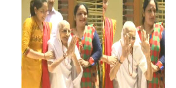 പ്രവർത്തകരെ അഭിവാദ്യം ചെയ്ത് ഹീരാബെൻ