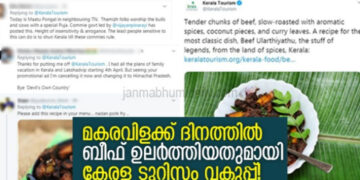 Kerala മകരവിളക്ക് ദിനത്തില് ബീഫ് ഉലര്ത്തിയതിന്റെ പാചക രീതി ട്വീറ്റ് ചെയ്ത് കേരള ടൂറിസം വകുപ്പ്; കേരളത്തിലേക്കുള്ള വിനോദസഞ്ചാരം അടക്കം ഉപേക്ഷിച്ച് പ്രതിഷേധം