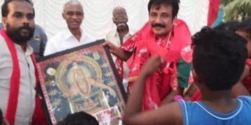 സിപിഎം സ്ഥാനാര്ഥി അയ്യപ്പചിത്രം ഉപയോഗിച്ച് വോട്ടഭ്യര്ഥിക്കുന്നു