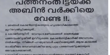 Kerala ആറന്മുളയില് അബിന് വര്ക്കിയെ വേണ്ടെന്ന് പോസ്റ്റര് , കോണ്ഗ്രസുകാരുടെ ഹൃദയവികാരത്തെ മുറിവേല്പ്പിക്കരുത്