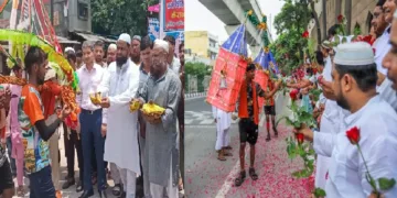 India കാവിയുടുത്ത് സിന്ദൂരം തൊട്ട് എത്തിയ ശിവഭക്തരെ പൂക്കൾ ചൊരിഞ്ഞ് സ്വാഗതം ചെയ്ത് മുസ്ലീം വിശ്വാസികൾ ; ഭക്ഷണവും, വെള്ളവും നൽകി സ്വീകരണം